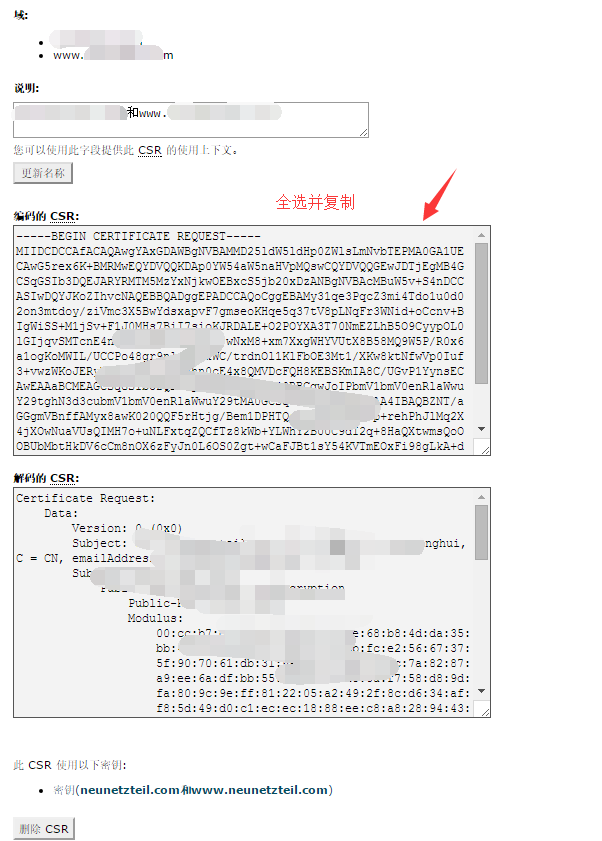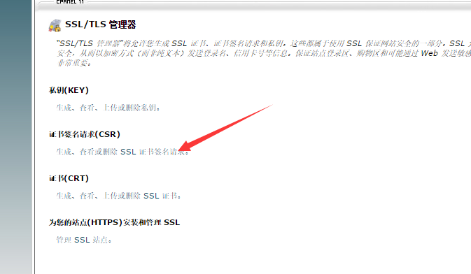 1. 登录到cPanel控制面板,进入“SSL/TLS管理器”,选择证书签名请求(CSR),按照提示生成CSR,然后全选复制。
