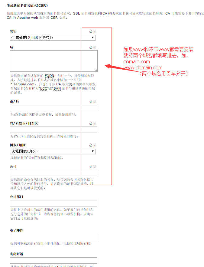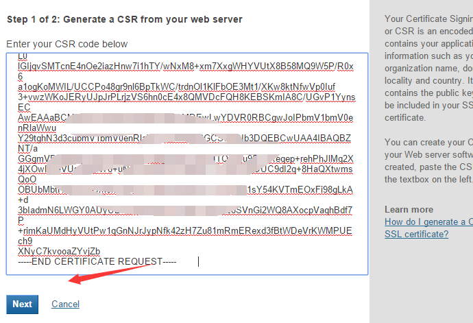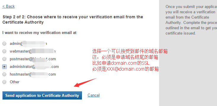 3.然后把CSR文件复制进去,然后再选择一个可以接受邮件的域名邮箱(必须是申请域名结尾的邮箱,比如申请domain.com的SSL证书,那么必须是xxx@domain.com的邮箱)。