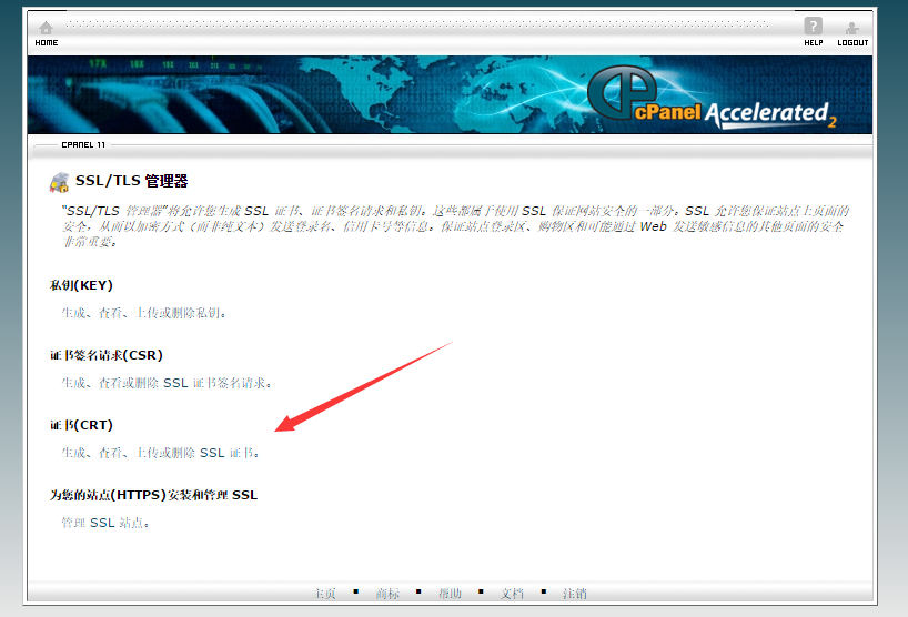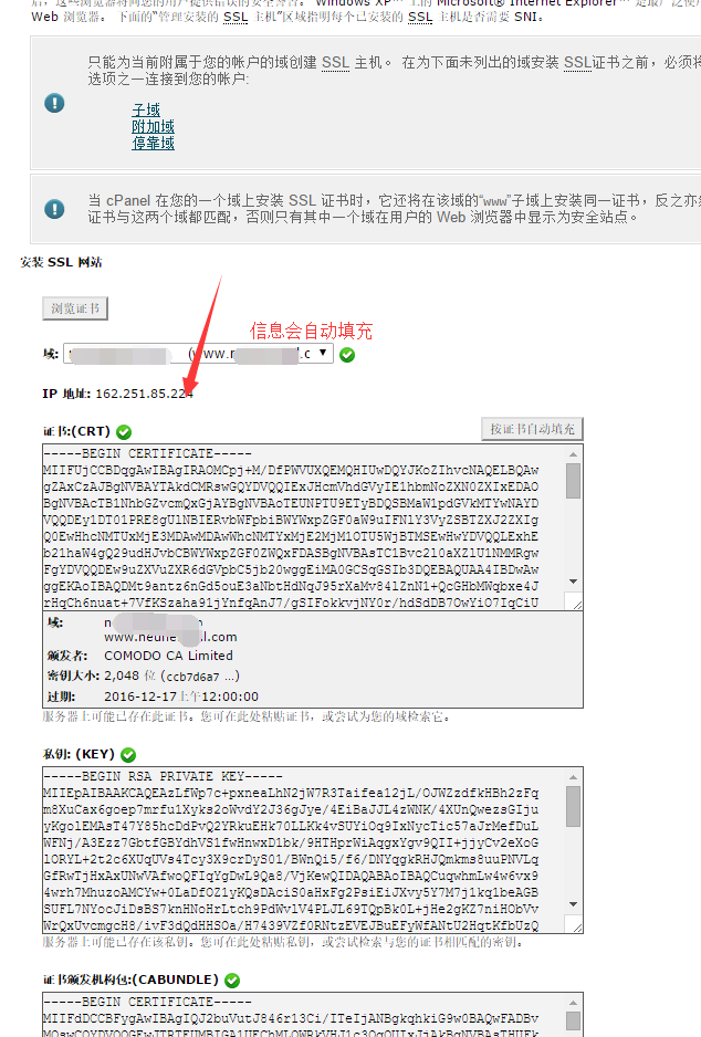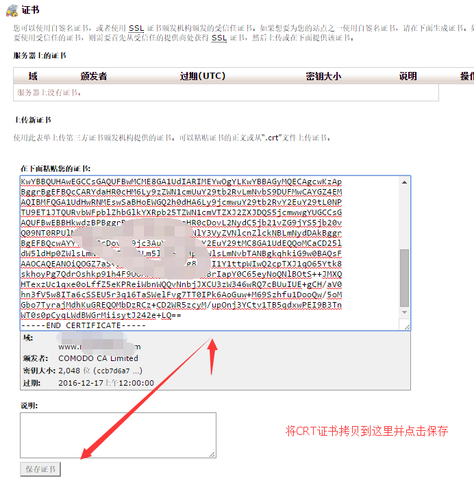5.然后再回到cPanel面板里面的SSL/TLS管理器,然后点击“证书(CRT),根据提示把CRT证书复制进去,保存证书,返回就能看到对应的证书了。