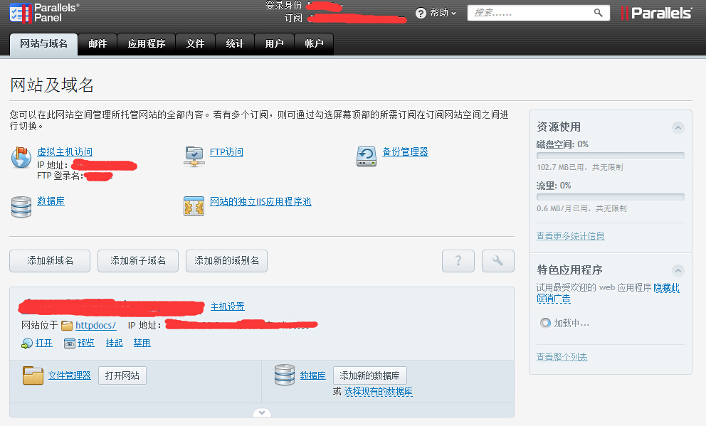 BlueHost Windows主机采用的Plesk控制面板是Parallels公司旗下的一款专用于管理主机的系统,其界面如下图所示,界面简洁,功能列表清晰。据小编测试,目前Plesk面板的主题样式是固定的,但可以通过设置域名列表模式。