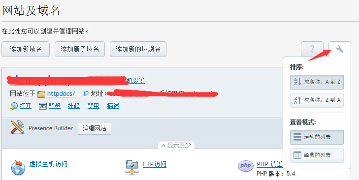 大家登录Plesk控制面板,在“网站及域名”页面上能看到自己绑定域名的列表。通过设置模式,可以更改下列表排序模式(如下图):