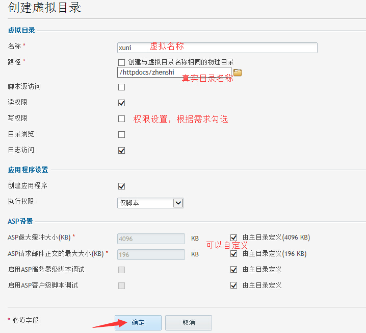 3. 在创建虚拟目录页面,输入虚拟目录名称(如“xuni”)和正确的路径(物理目录),以及设置读写权限等(根据需求设置)。设置完成后点击“确定”即可完成。