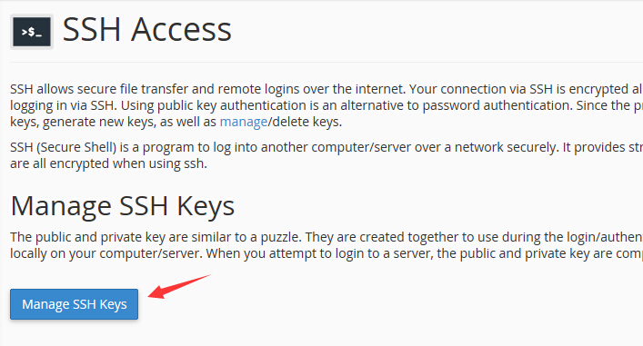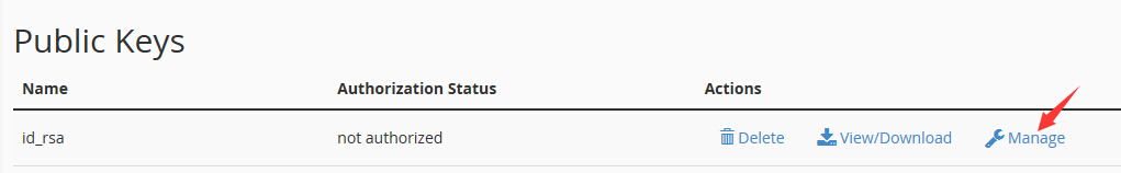 1. 返回到“Manage SSH Keys”页面,在Public Keys列表信息中有我们创建的密钥,点击后面的“Manage”;