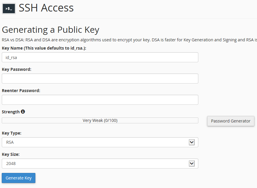 2)密钥类型有“DSA”和“RSA”两种,DSA在密钥生成及登录上速度较快,RSA则验证花费时间更短,建议选RSA;