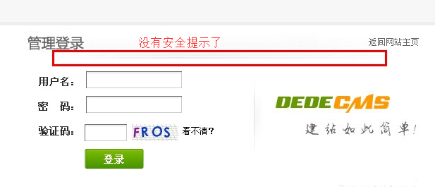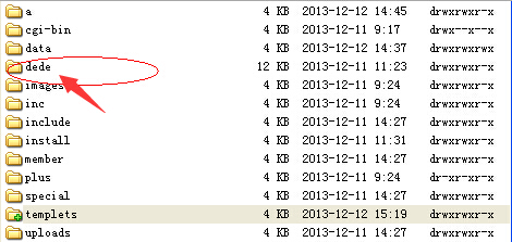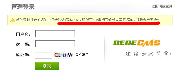 1. 默认情况下我们登录后台时,会看到提醒:您的管理目录的名称中包含默认名称dede,建议在FTP里把它修改为其他名称,那样会更安全!