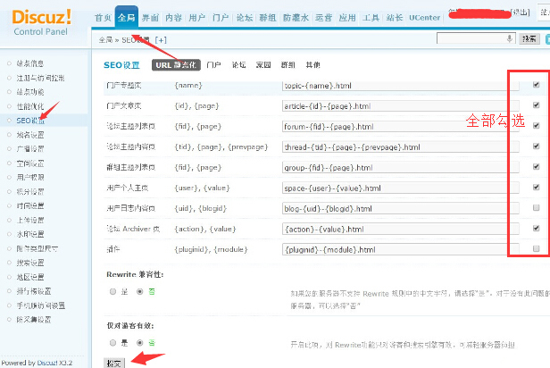 - 开启论坛SEO伪静态。适用管理员账号登录到Discuz论坛后台,依次点击“全局”—“SEO设置”,在URL伪静态栏目下,勾选所有的URL为伪静态,如图所示: